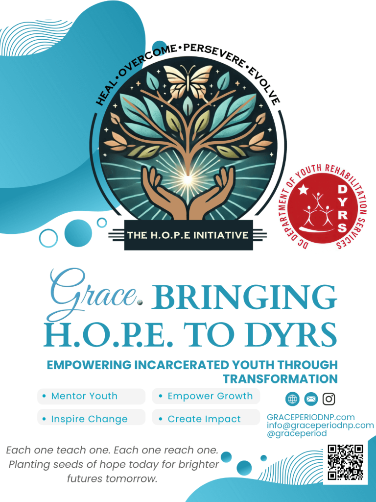 Grace Period is thrilled to announce a new partnership with the Department of Youth Rehabilitation Services (D.Y.R.S.) in Washington, D.C., launching in early November. Through our transformational program, The H.O.P.E. Initiative (Heal, Overcome, Persevere, Evolve), we’ll be spending several weeks working directly with incarcerated youth, bringing messages of encouragement, resilience, and hope.