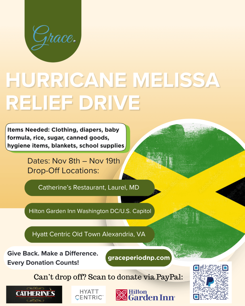 Grace Period is honored to announce that the Hilton Garden Inn U.S. Capitol – NOMA (Washington, DC) and Hyatt Centric Old Town Alexandria (Virginia) have officially joined our Hurricane Melissa Relief Drive in partnership with Catherine’s Italian Caribbean Restaurant in Laurel, Maryland. Together, these partners now provide three convenient locations covering the entire DMV area, making it easier than ever for the community to support families in Jamaica affected by Hurricane Melissa.